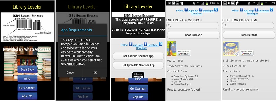 Library Leveler Delivers fast Results: Upon scanning an ISBN Bar code; or entering the Book title or ISBN#; The book title, author, publisher, Grade Level Equivalent, Lexile Measure, DRA and Guided Reading Level are provided, along with a picture of the book cover. The database of books that are leveled consists of 250,000+books. As an additional benefit, this app is recommended to parents to allow them to make informed decisions when purchasing "just right books" for their children.